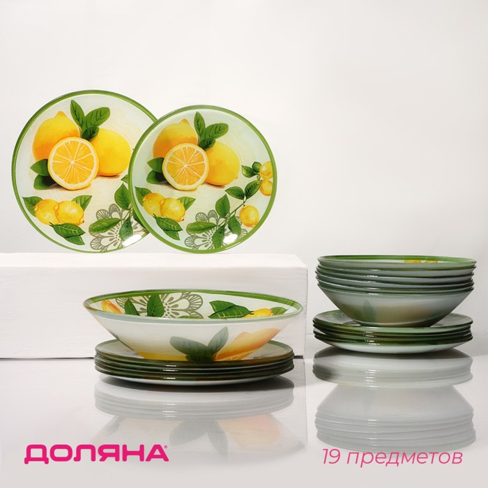 Набор тарелок стеклянных Доляна «Дольче», 19 предметов: 6 десертных тарелок, 6 обеденных тарелок, 6 мисок, салатник