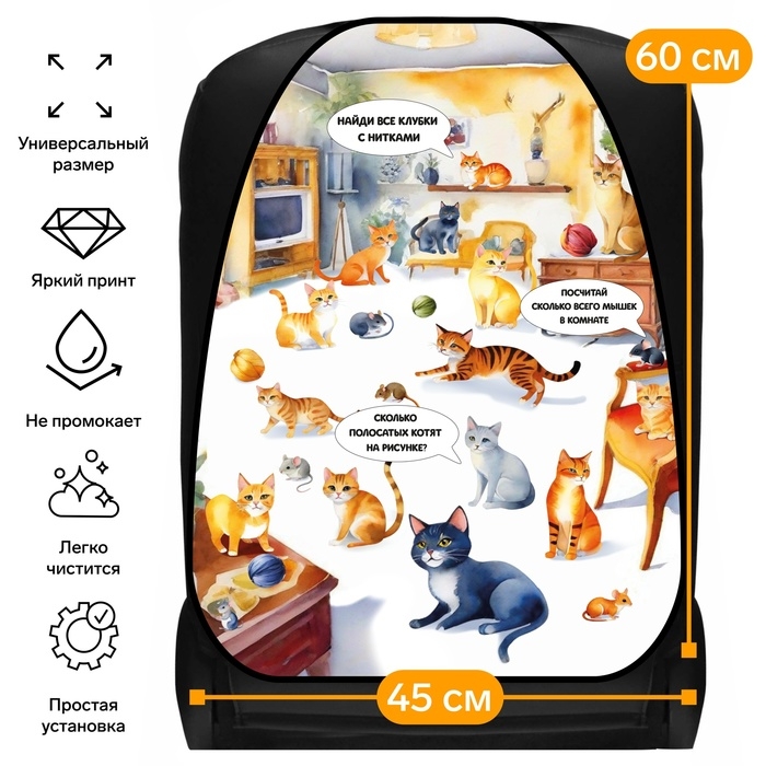 Размер накидки составляет 60х45 см. Благодаря универсальным креплениям, она легко устанавливается на сиденье автомобиля, защищая его от загрязнений и износа. Накидка проста в уходе, ее можно легко снять и постирать при необходимости.