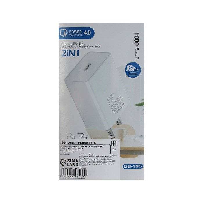 Сетевое зарядное устройство GQ-195, Type-C, 3 A, 66 W, белое