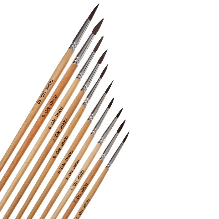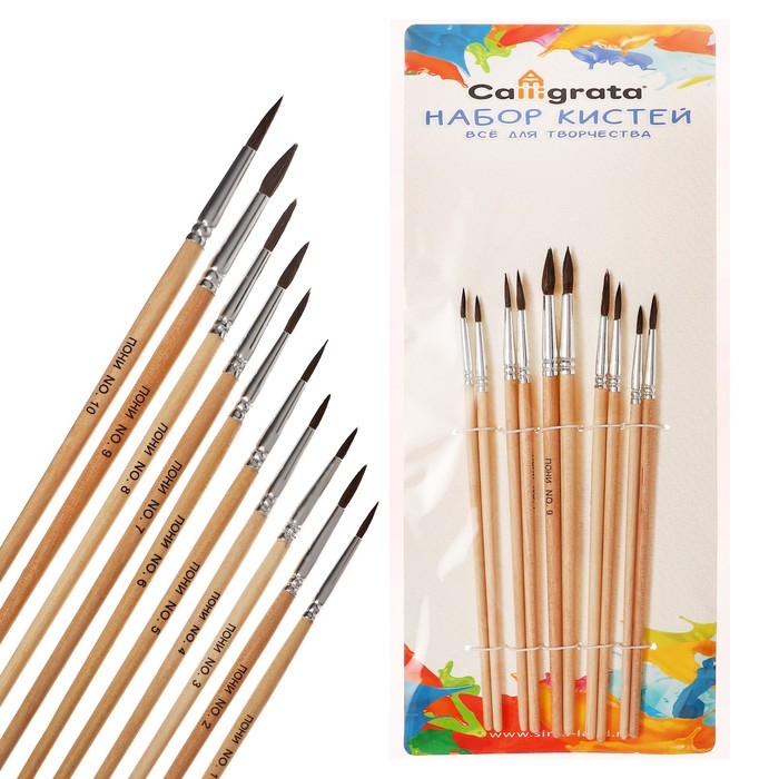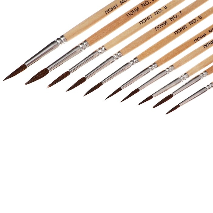 Набор кистей пони 10 штук ( круглые: №1, 2 ,3 , 4, 5, 6, 7, 8, 9, 10), с деревянными ручками на блистере
