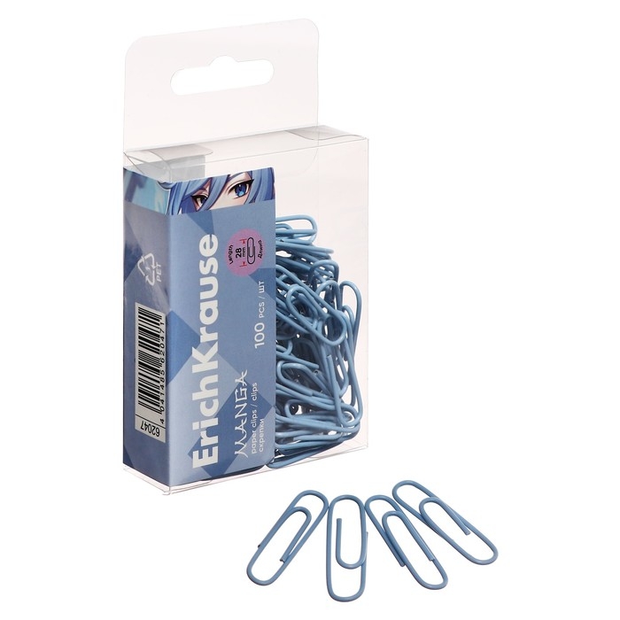 Скрепки канцелярские 28 мм, 100 штук, ErichKrause Manga, цветные с виниловым покрытием, пластиковая коробка, бледно-голубые