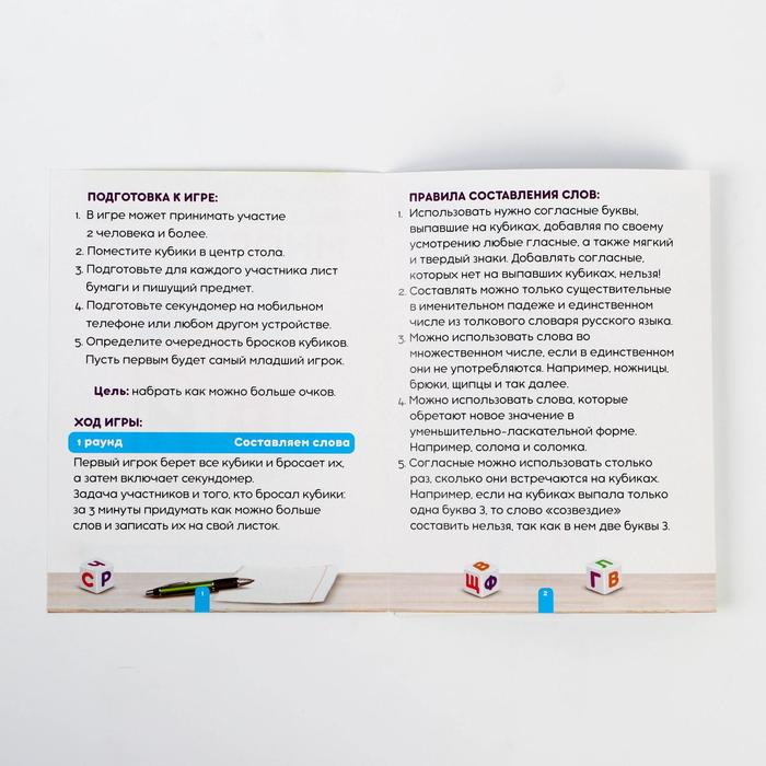 - Используйте согласные буквы, выпавшие на кубиках, добавляя по своему усмотрению любые гласные, а также мягкий и твёрдый знаки. Добавлять согласные, которых нет на верхних гранях кубиков, нельзя!