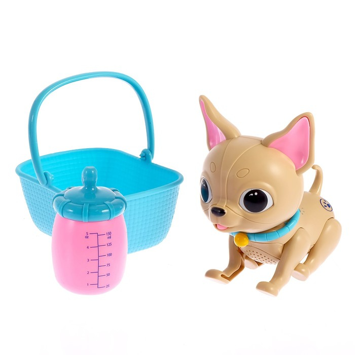 Питомец реагирует только на свою бутылочку. Пёсик лижет её, аппетитно причмокивая язычком. А также у него светятся глазки, и он забавно качает головой.