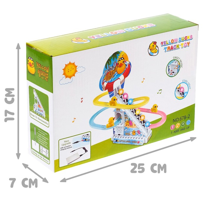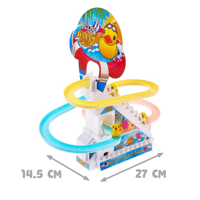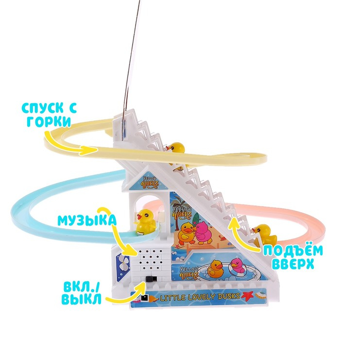 - Пусть малыш расставит уточек у основания эскалатора, и они начнут подниматься вверх под весёлую музыку.