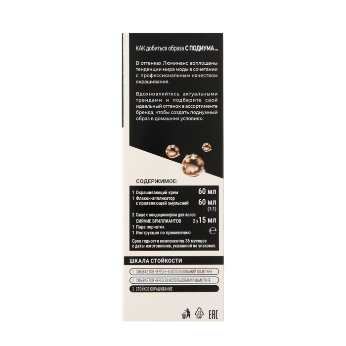 В оттенках стойкой краски для волос Люминанс воплощены последние тенденции мира моды и окрашивания в сочетании с профессиональным результатом. Формула с аммиаком и2х-ступенчатой системой сияние бриллиантов позволяет добиться восхитительной яркости цвета до 10 недель и экстраблеска.