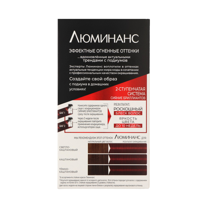 В оттенках стойкой краски для волос Люминанс воплощены последние тенденции мира моды и окрашивания в сочетании с профессиональным результатом. Формула с аммиаком и 2х-ступенчатой системой сияние бриллиантов позволяет добиться восхитительной яркости цвета до 10 недель и экстраблеска.