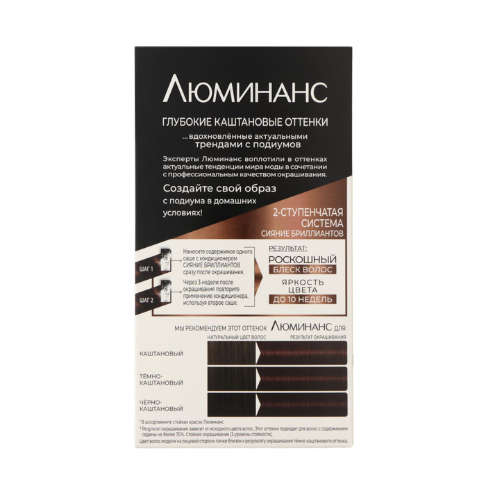 В оттенках стойкой краски для волос Люминанс воплощены последние тенденции мира моды и окрашивания в сочетании с профессиональным результатом. Формула с аммиаком и 2х-ступенчатой системой сияние бриллиантов позволяет добиться восхитительной яркости цвета до 10 недель и экстраблеска.