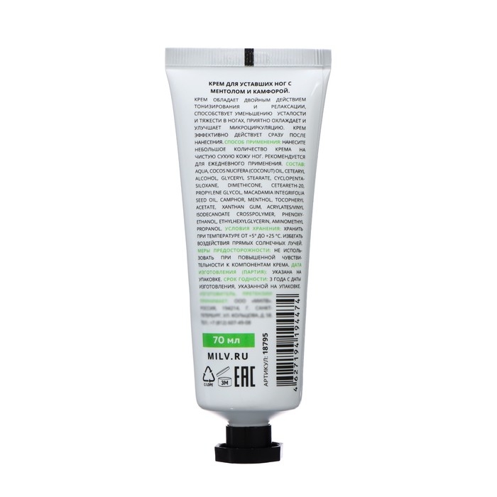 Крем для уставших ног MILV с ментолом и камфорой, 70 мл