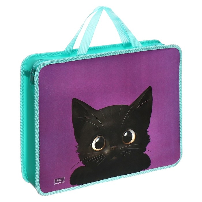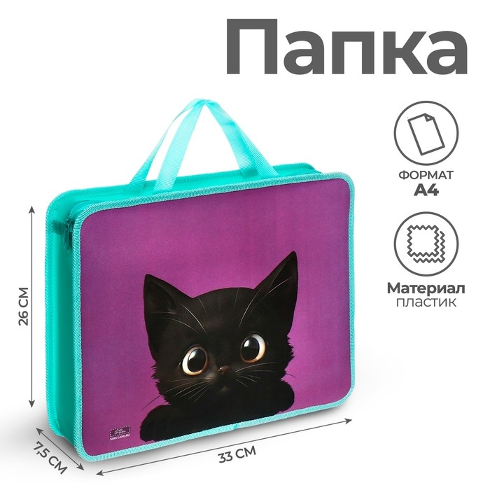 Папка с ручками А4, 330 х 260 х 75 мм, пластиковая, ручки-тесьма, Calligrata "Котик черный"