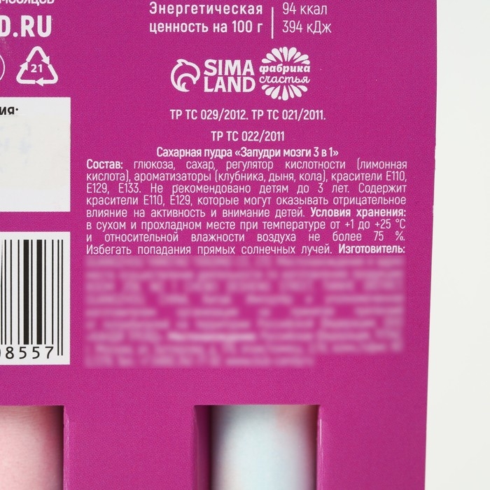Состав: глюкоза, сахар, регулятор кислотности (лимонная кислота) , ароматизаторы (клубника, дыня, кола), красители Е110, Е129, Е133.