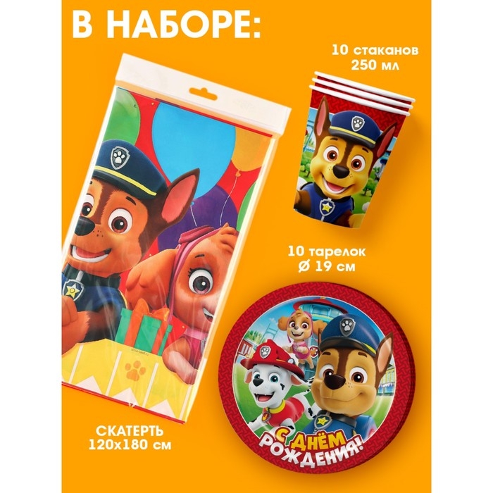 Набор бумажной посуды Щенячий патруль, 10 персон (стакан, тарелка, скатерть)