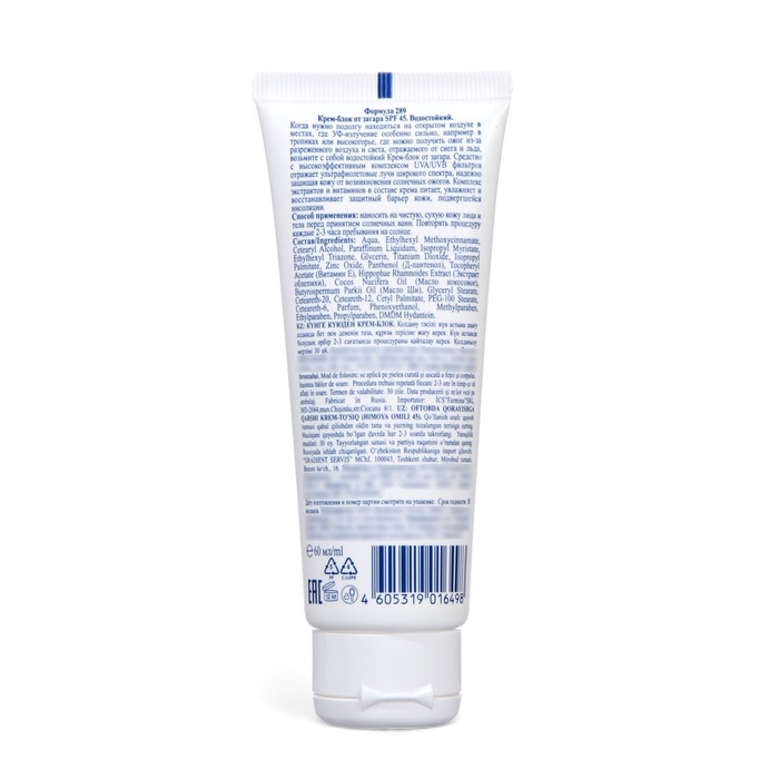 Aqua, Ethylhexyl Methoxycinnamate, Cetearyl Alcohol, Paraffinum Liquidum, Isopropyl Myristate, Benzophenone-3, Glycerin, Titanium Dioxide, Isopropyl Palmitate, Zinc Oxide, Panthenol (Д-пантенол), Tocopheryl Acetate (Витамин Е), Hippophae Rhamnoides Extract (Экстракт облепихи), Cocos Nucifera Oil (Масло кокосовое), Butyrospermum Parkii Oil (Масло Ши), Glyceryl Stearate, Ceteareth-20, Ceteareth-12, Cetyl Palmitate, PEG-100 Stearate, Ceteareth-6, Parfum, Phenoxyethanol, Methylparaben, Ethylparaben, Propylparaben, DMDM Hydantoin.
