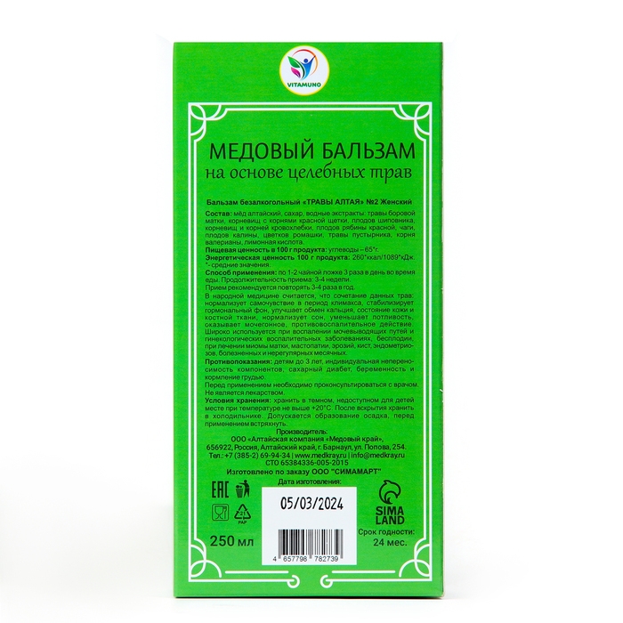Бальзам медовый безалкогольный Vitamuno Женский, 250 мл