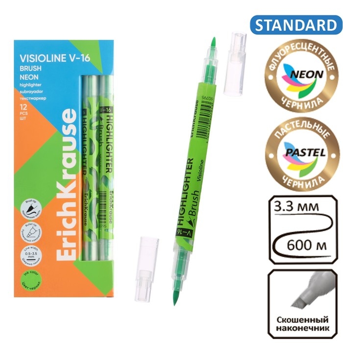 Двухсторонний текстмаркер ErichKrause Visioline V-16 Brush Neon, цвет чернил зеленый (в коробке по 12 шт.)