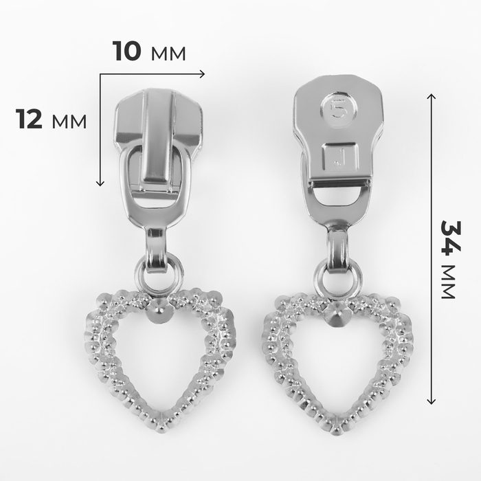 Бегунок автоматический для металлической молнии, №5, декоративный «Сердце», 10 шт, цвет никель