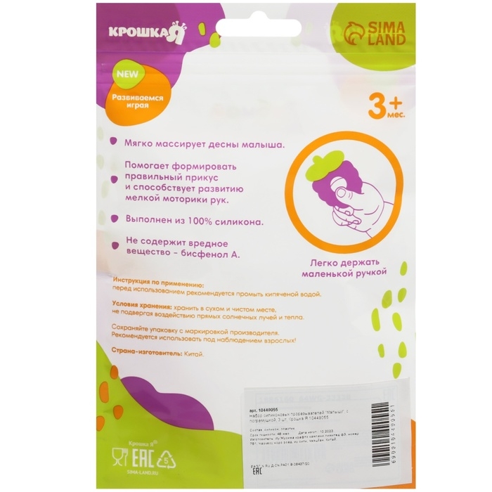 Товар изготовлен из прочного и безопасного силикона, не содержащего бисфенола А. Рекомендовано для детей от 3 месяцев.