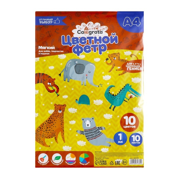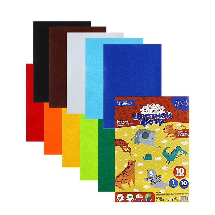 Фетр цветной набор, толщина-1 мм, формат А4, мягкий, 10 листов, 10 цветов, яркие цвета