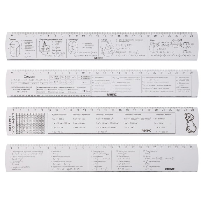Набор справочных линеек 4 штуки, Calligrata 25 см, таблица умножения, химия, геометрия, физика