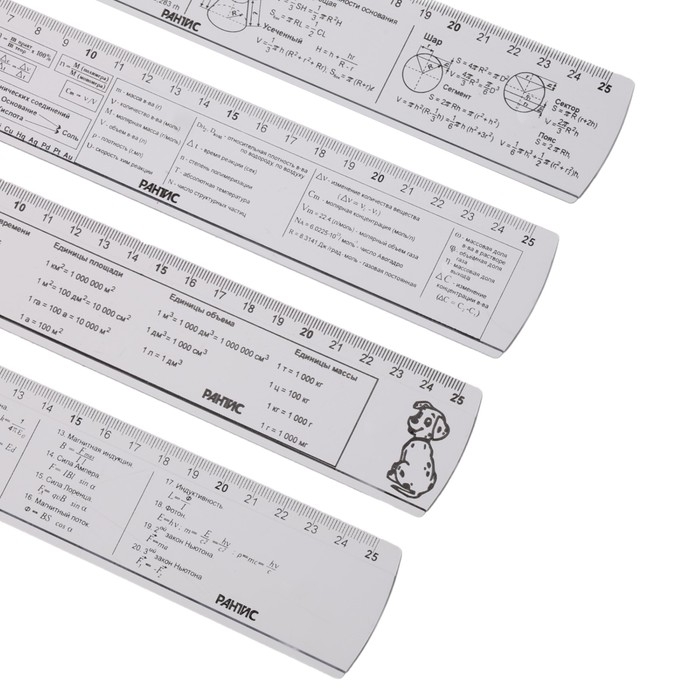 Набор справочных линеек Calligrata – отличный помощник для создания ровных линий. Широкие линейки–шпаргалки выпускается с справочными материалами по алгебре, химии, геометрии, физике. Чёткое нанесение информации. Размер товара – 25 см, ширина – 35 мм. Изделие имеет гладкую глянцевую поверхность