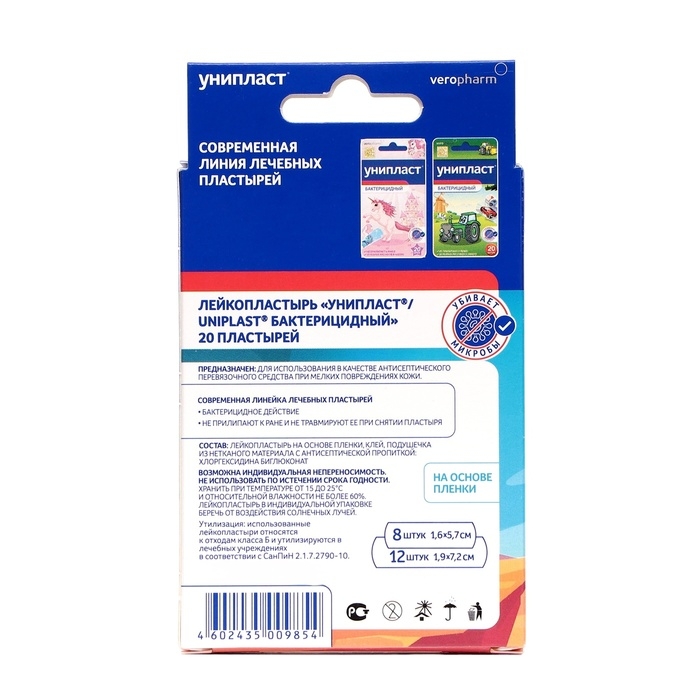 Лейкопластырь "УНИПЛАСТ бактерицидный" представляет собой липкую основу - лейкопластырь "Унипласт фиксирующий" или лейкопластырь Верофарм с прикрепленной к ней прокладкой из нетканого материала, пропитанного раствором хлоргексидина биглюконата, покрытую с липкой стороны защитным покрытием.