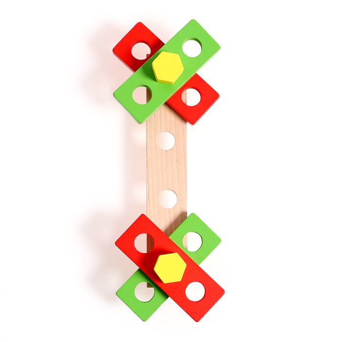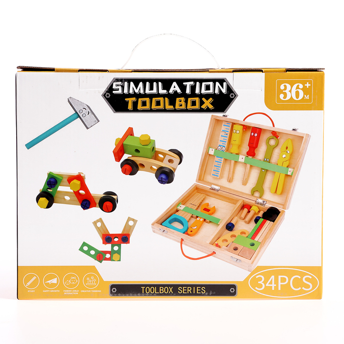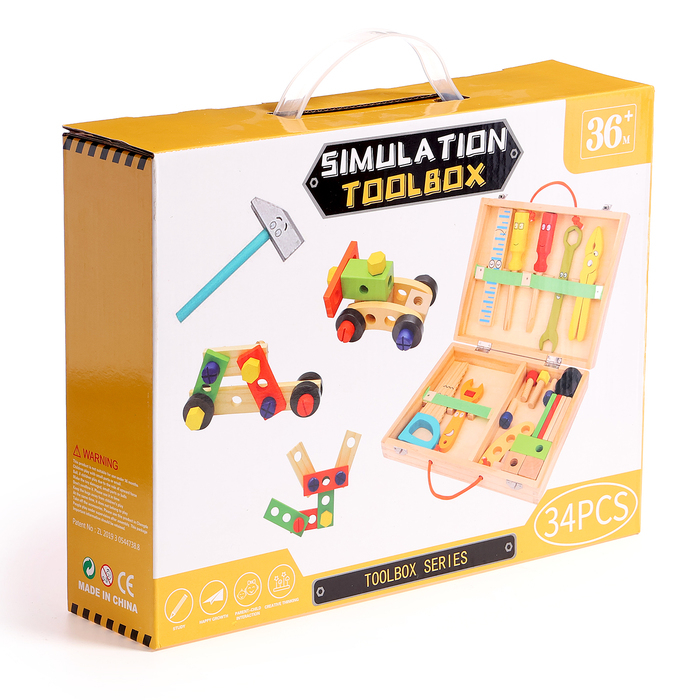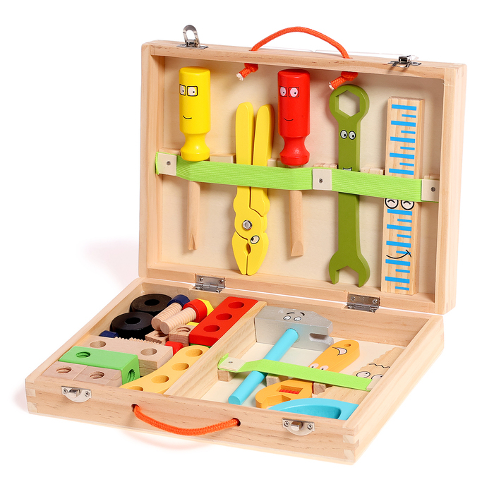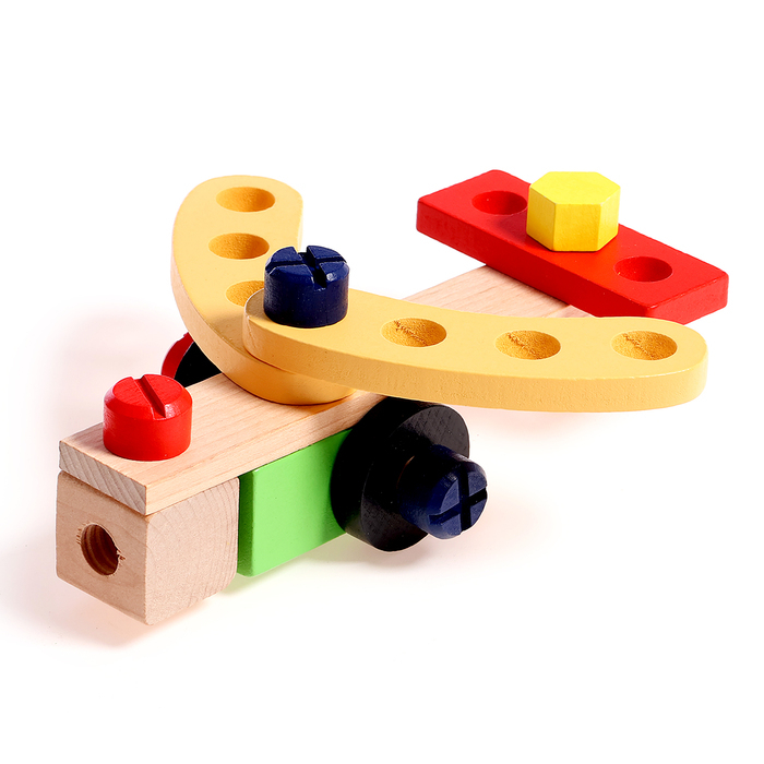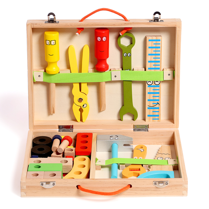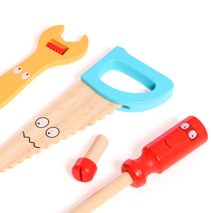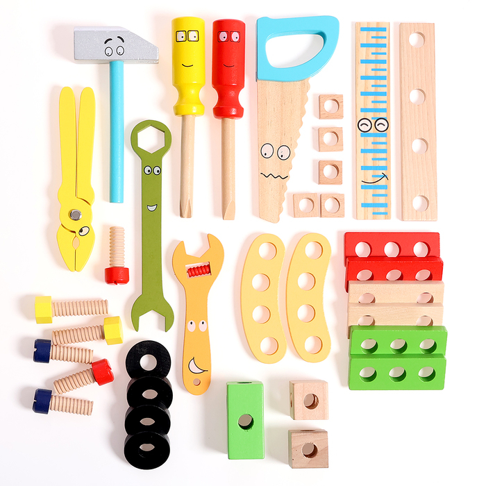 В наборе есть 33 различных элементов и инструментов, таких как молоток, плоскогубцы, винты и т. д. Детали покрыты нетоксичной краской, безопасной для здоровья детей.