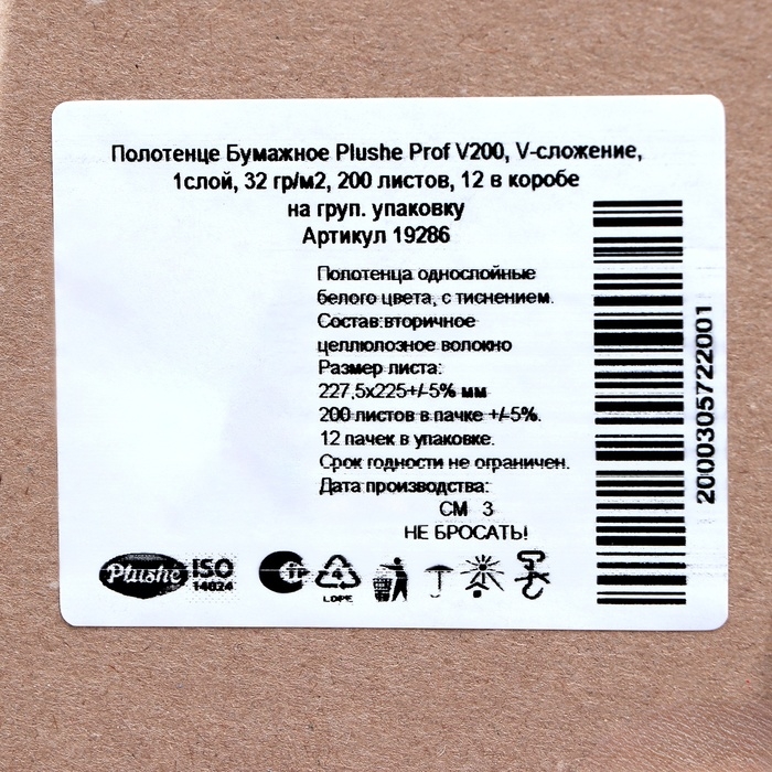 Полотенца бумажные Plushe Professional V-сложения, 32 г/м2, 1 слой, 200 листов