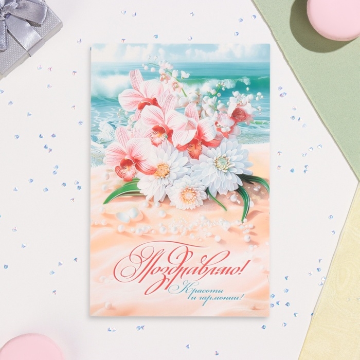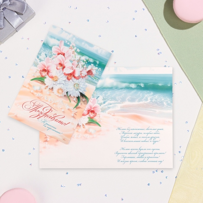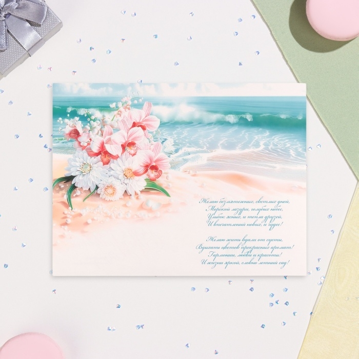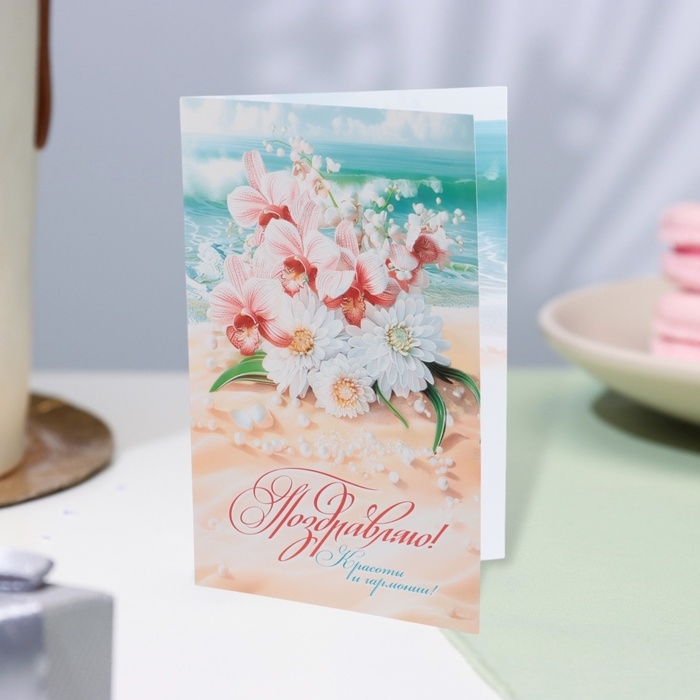 Открытка "Поздравляю!" пляж, букет, 19 х 29 см