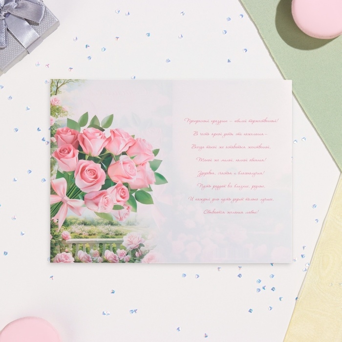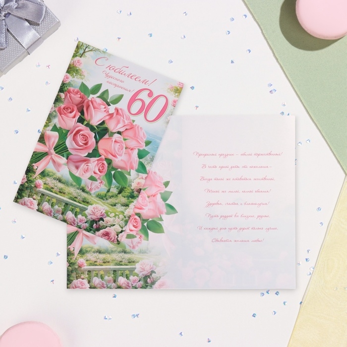 Открытка "С Юбилеем! 60" глиттер, конгрев, розовые розы, 19 х 29 см