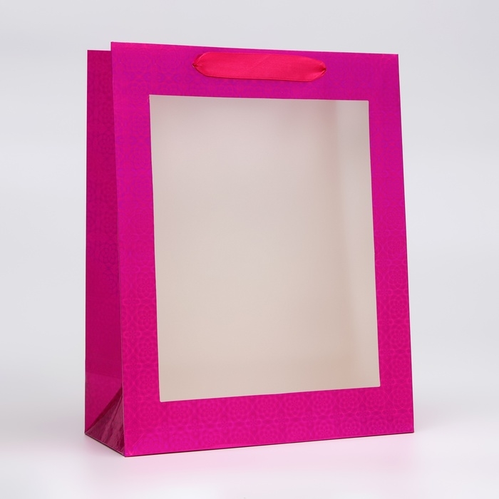 Пакет подарочный, фольгированный, упаковка, с окном, "Розовый", M 32 х 25,5 х 11 см