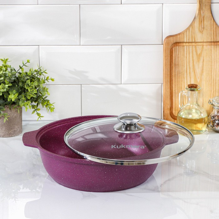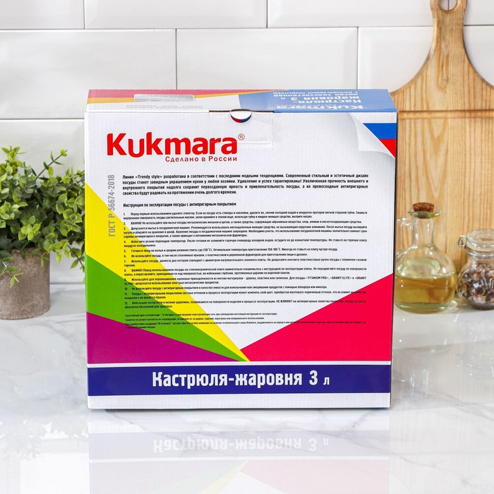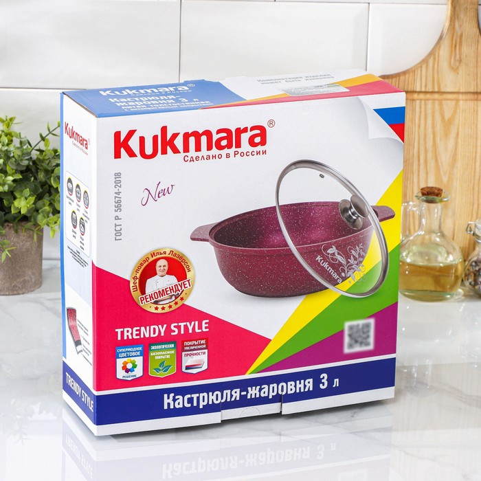 Посуда линии Trendy style разработана в соответствии с последними модными тенденциям. Кастрюля-жаровня Kukmara сделана из литого алюминия. С внутренней и внешней стороны имеет антипригарное покрытие повышенной прочности на водной основе, которое изготовлено по немецким технологиям (Weilburger Coatings GmbH).