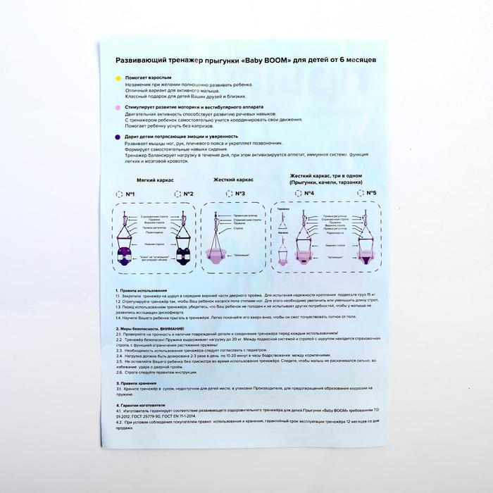 Посадите полугодовалого кроху в сиденье-штанишки. Малышу понравится активная игра, он будет подпрыгивать и качаться. Размер посадочного места можно настроить индивидуально, а за перекладину ребёнку будет удобно держаться.