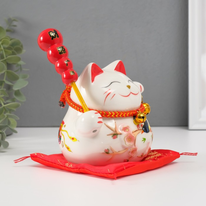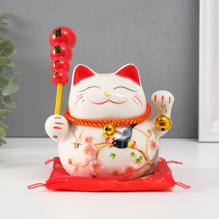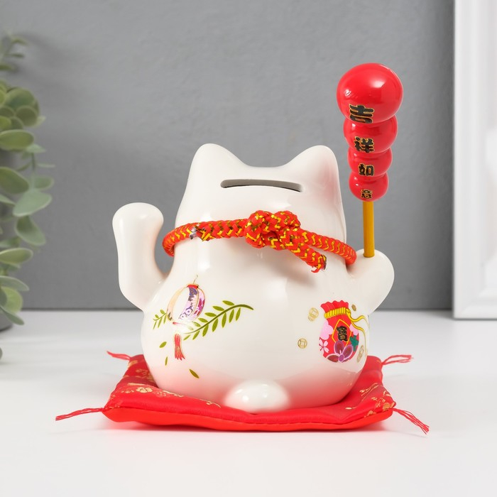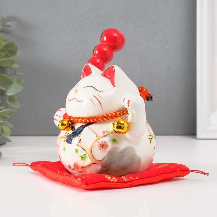 Копилка керамика "Кот манэки-нэко на коврике с колокольчиками" 12,5х13х10,5 см