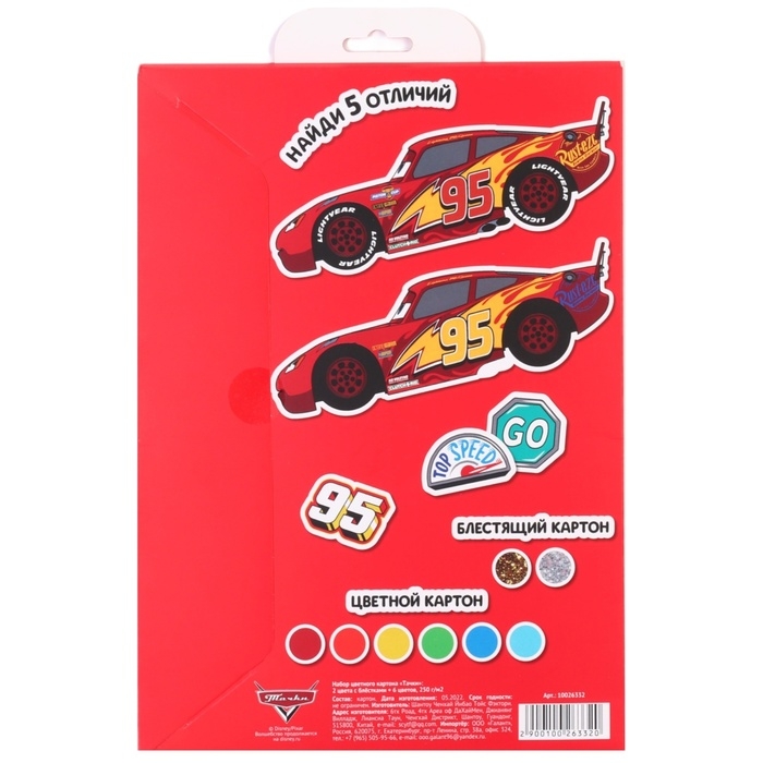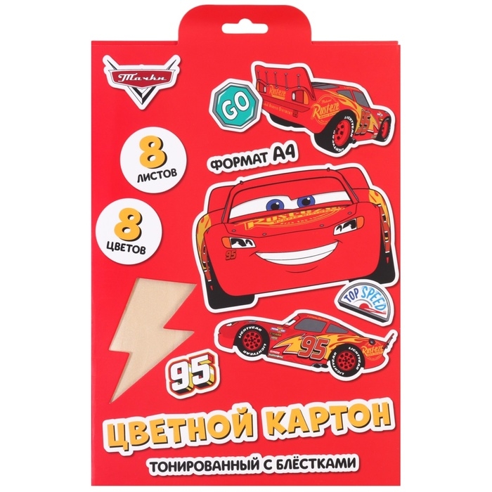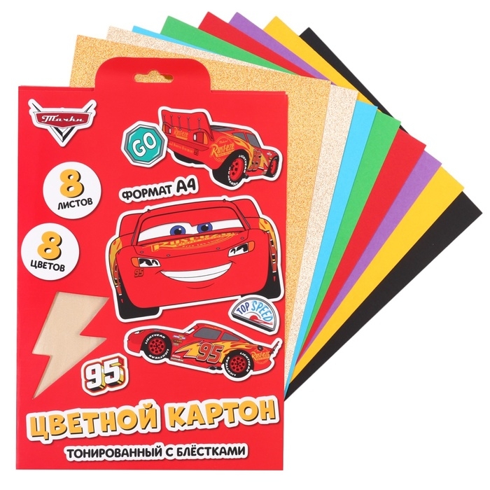 Картон цветной с блёстками, А4, 8 листов, 8 цветов, немелованный, двусторонний, в папке, 250 г/м², Тачки