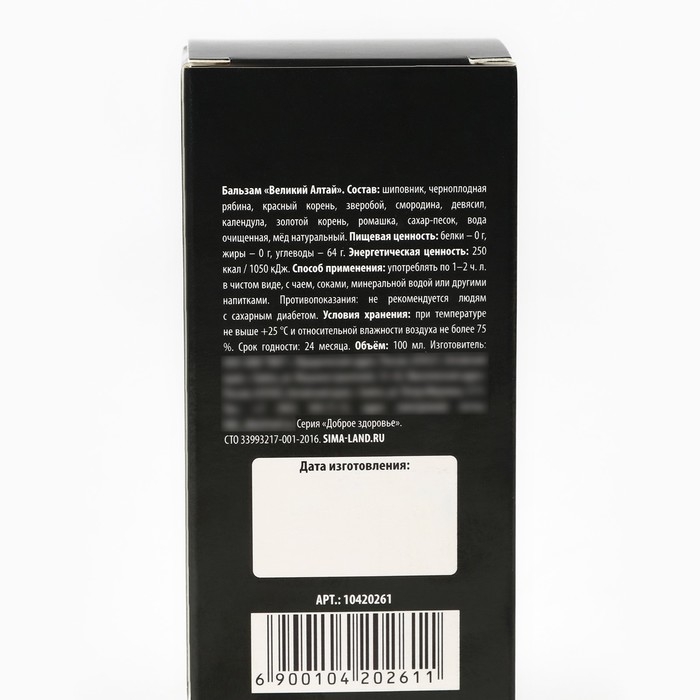 Состав: шиповник, черноплодная рябина, красный корень, зверобой, смородина, девясил, календула, золотой корень, ромашка, сахар-песок, вода очищенная, мёд натуральный.
