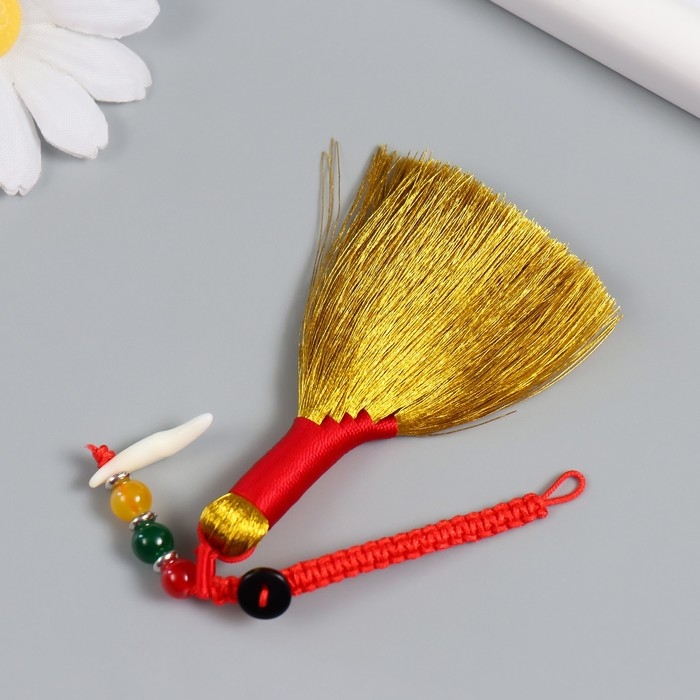 Подвеска текстиль "Золотая метла с клыком. Иероглиф - Счастье" 14,5 см
