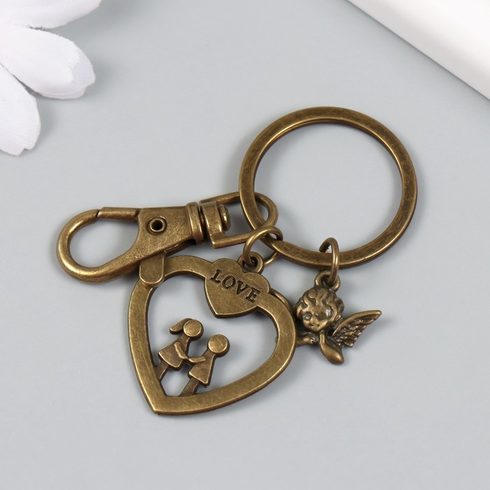Брелок металл с карабином "Ангел и парочка в сердце" бронза 6 см