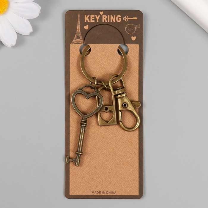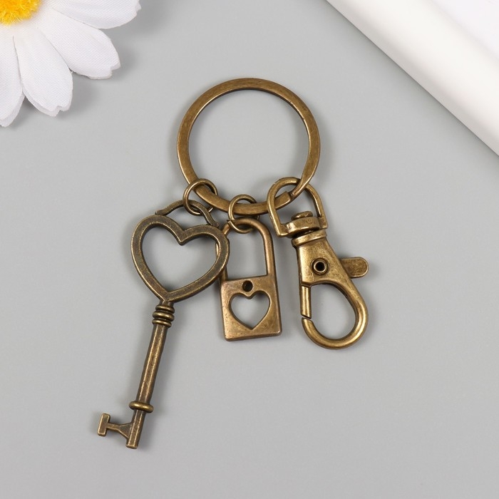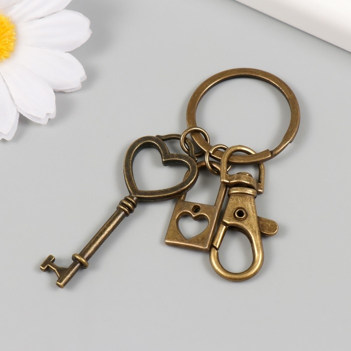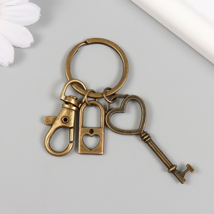Брелок металл с карабином "Ключик и замочек с сердцем" бронза 8 см