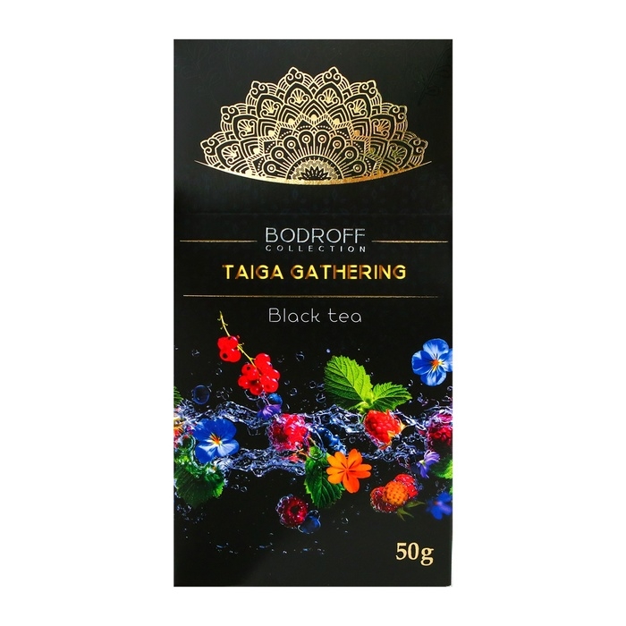 Чай "TAIGA GATHERING" - это премиальный чёрный цейлонский чай, представленный в элегантной оригинальной упаковке. Этот чай отличается своим изысканным вкусом и ароматом, который создаётся благодаря сочетанию листа брусники, ягод черноплодной рябины, красной смородины и малины.