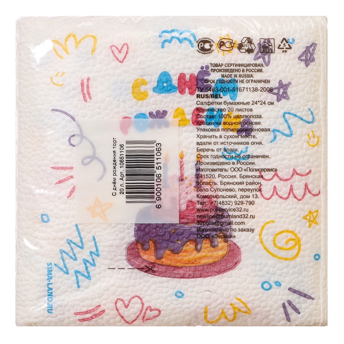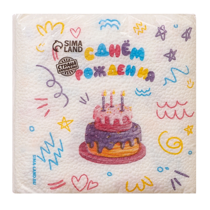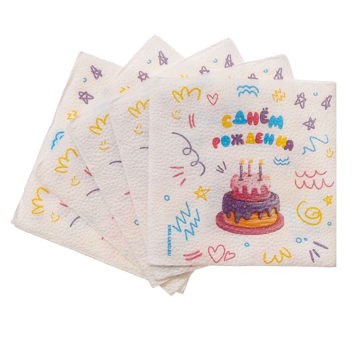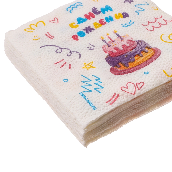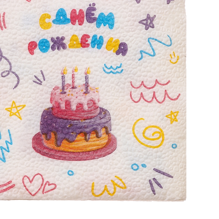 Салфетки бумажные однослойные "С днём рождения" торт 24х24 см, набор 20 шт.