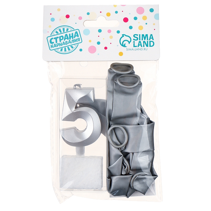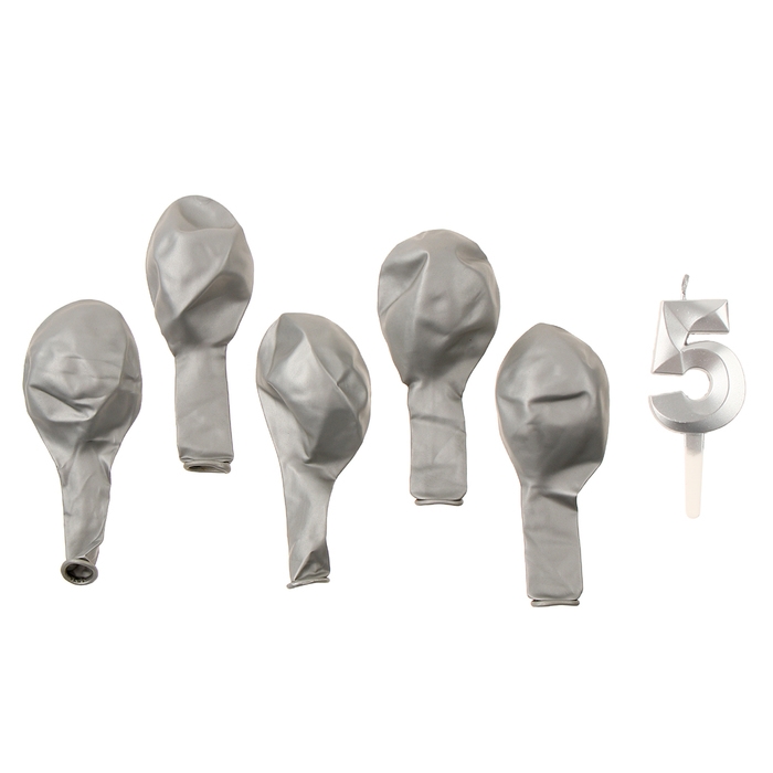 Свечи для торта + 5 шаров, цифра 5, серебро