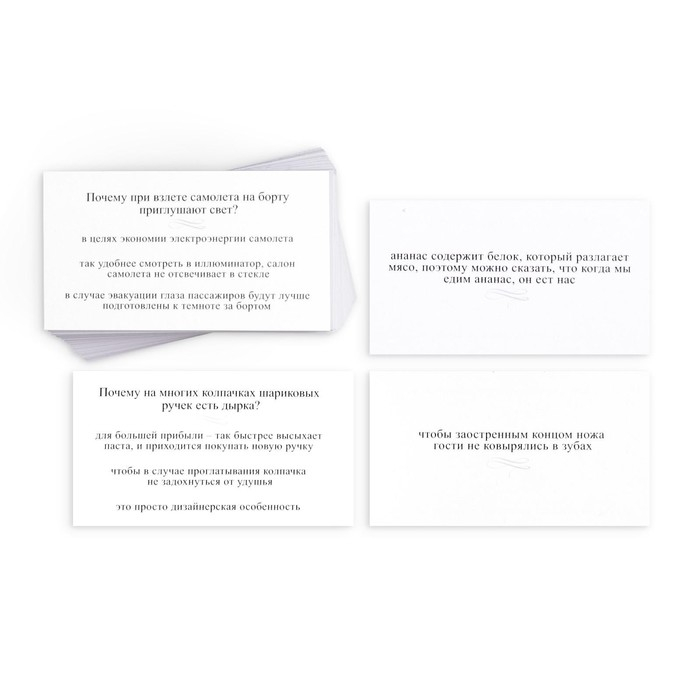 На лицевой стороне карточки написан вопрос и три варианта ответа. Правильный вариант только один. Задача игрока – определить его. Чтобы проверить себя или другого участника, просто переверните карту. Там находится ответ.