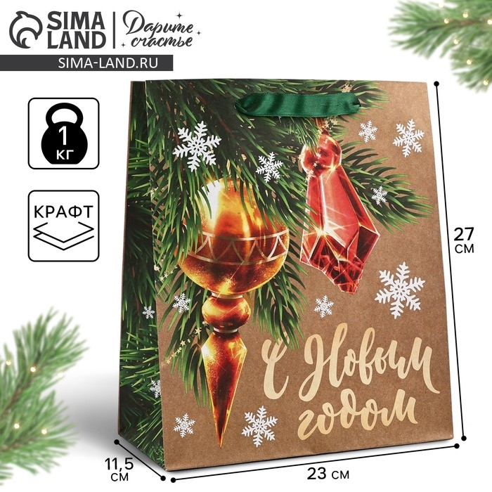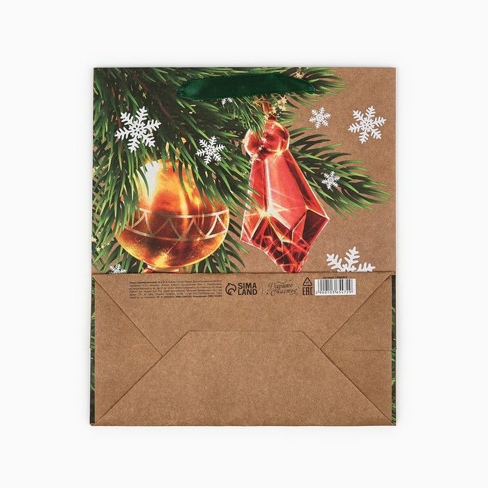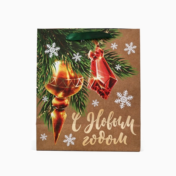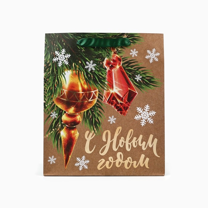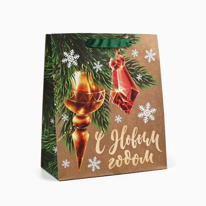 Пакет подарочный новогодний крафтовый вертикальный «С Новым годом», ёлочные игрушки, ML 23 х 27 х 11.5 см , Новый год