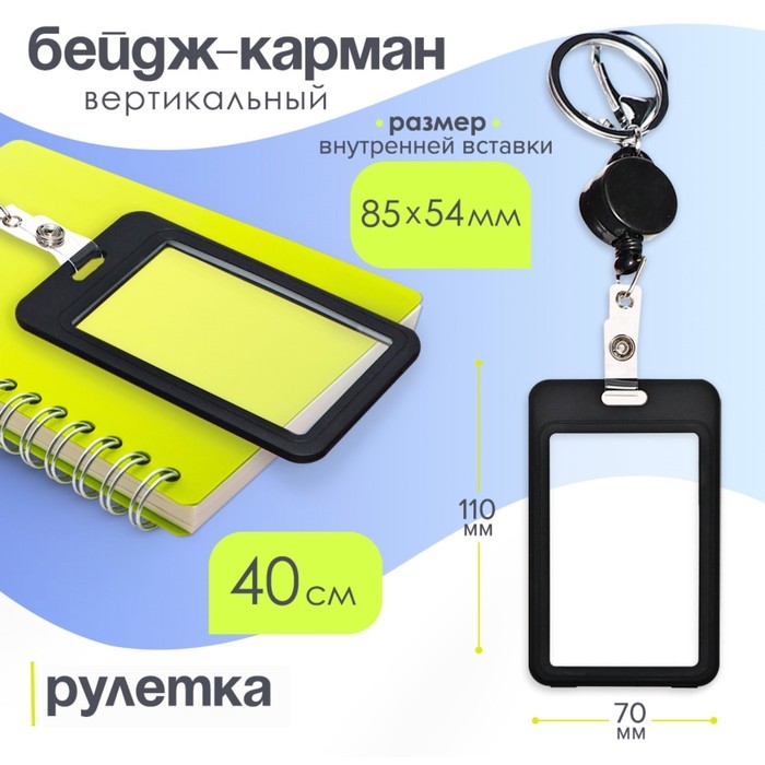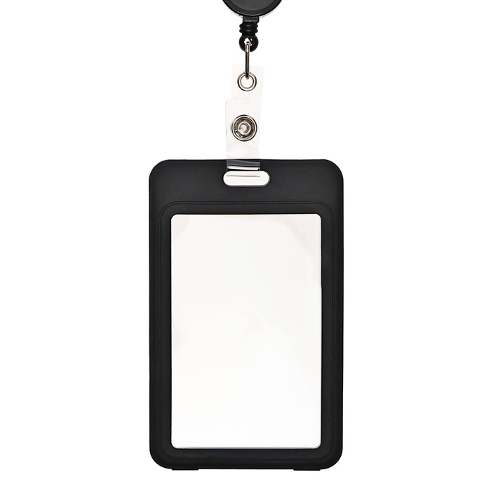 Бейдж-карман вертикальный пластиковый, внешний 110x70мм, внутренний 85x54мм, рулетка 40см, чёрный.