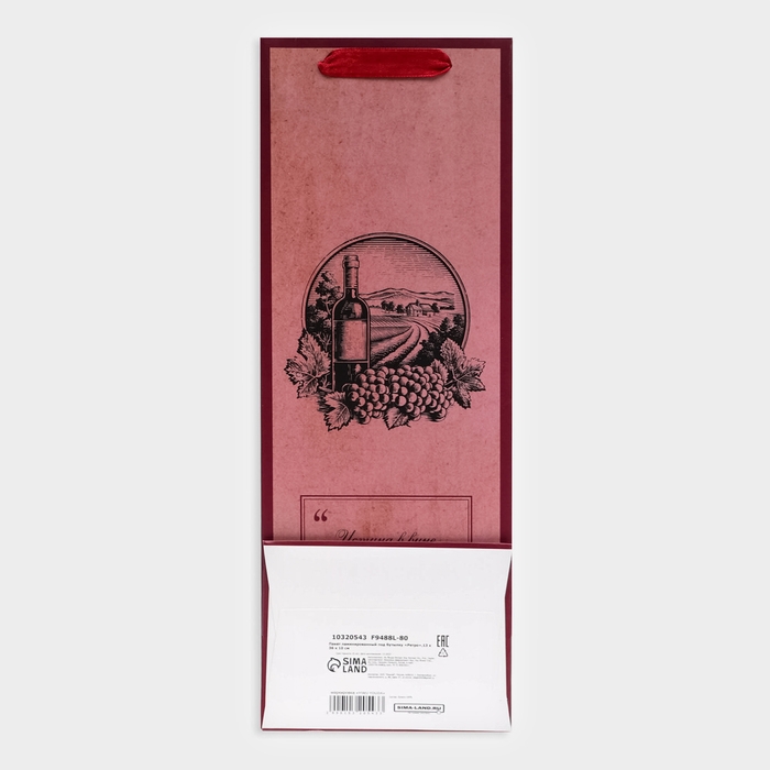 Пакет оснащен прочными ручками, что делает его удобным для носки. Ручки могут быть выполнены из различных материалов, например, из тесьмы или бумаги, что добавляет эстетический элемент к общему дизайну. Просторный верхний край пакета облегчает процесс упаковки и извлечения бутылки.