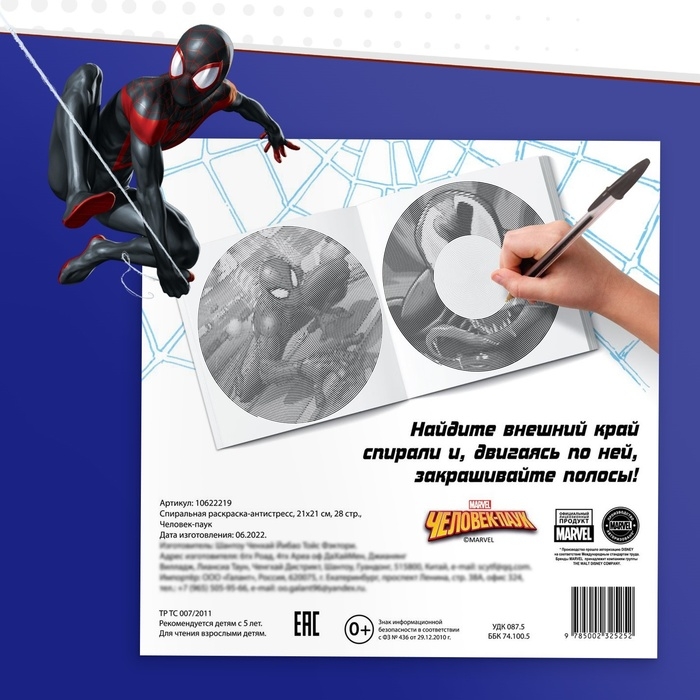Спиральная раскраска-антистресс, 21 × 21 см, 28 стр., Человек-паук