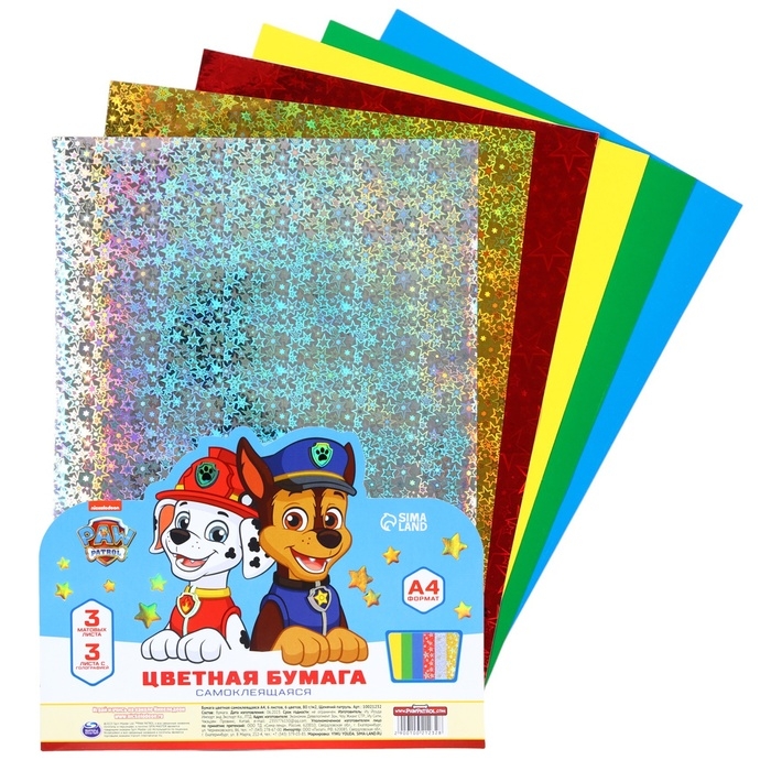 Бумага цветная самоклеящаяся А4, 6 листов, 6 цветов, 80 г/м2, Щенячий патруль