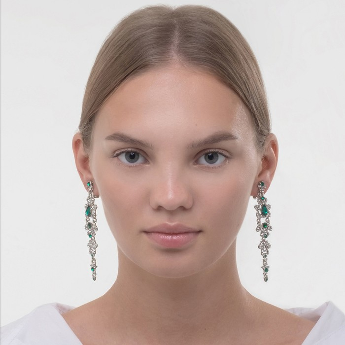 Клипсы «Ажур» капли с завитками, цвет бело-изумрудный в серебре