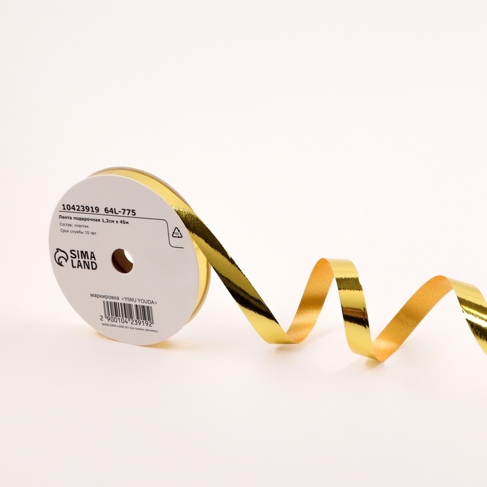 Лента для декора и подарков металлик, 1,2см х 45м, золотая