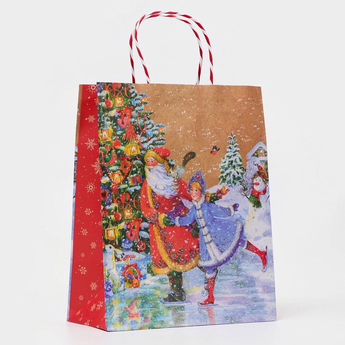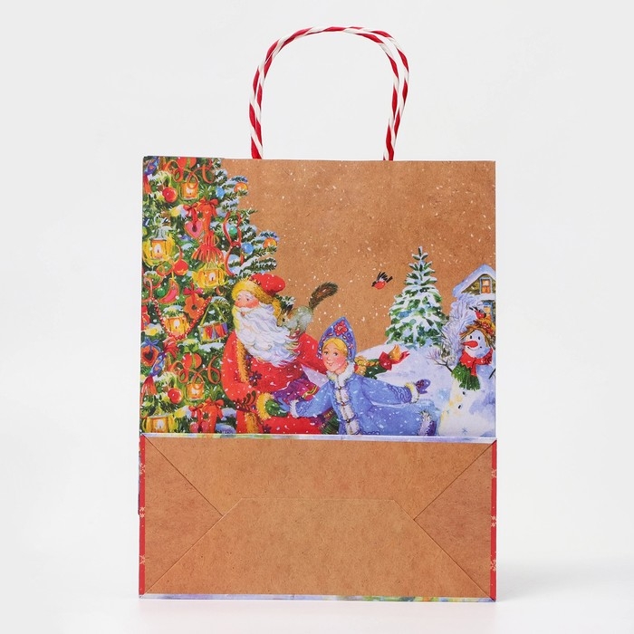 Новый год. Пакет бумажный подарочный новогодний крафт "Дед мороз и снегурочка" 18 х 22,3 х 10 см.
