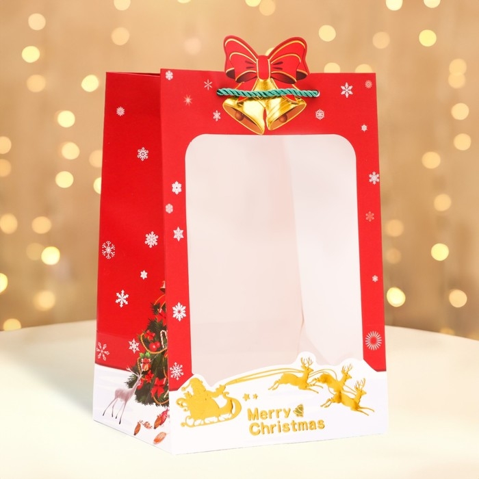 Пакет подарочный с окном новогодний имеет размеры 30 см в длину, 20 см в ширину и 16 см в высоту. Он выполнен из высококачественного материала, который обеспечивает его прочность и долговечность.